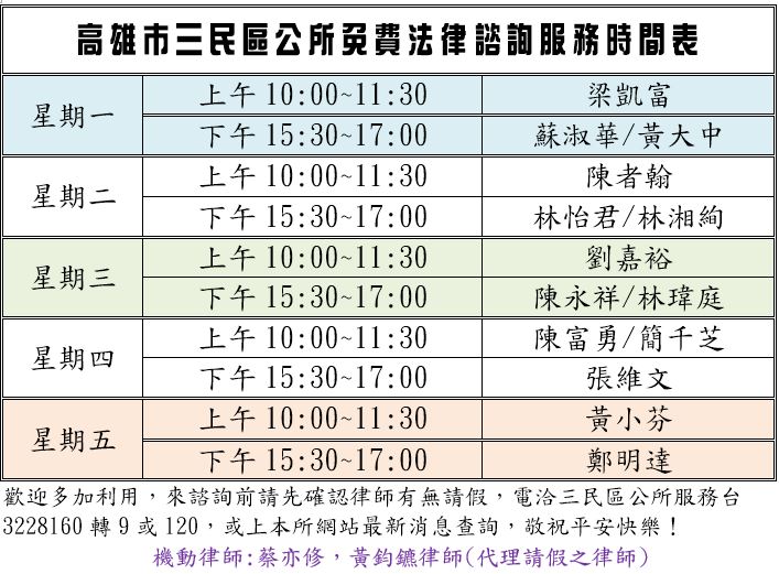 3.如遇律師請假,本所將於網站之-最新消息--事先公告,另亦可於諮詢時間前來電(07-3228160#117或120)確認律師是否請假,以免往返奔波!